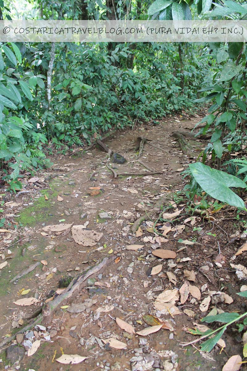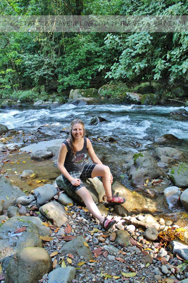 To reach the second swimming spot, follow El Salto Costa Rica‘s main trail where it travels east of the Tarzan rope swing. After an approximate five-minute downhill hike, the trail connects with a lower section of Rio Fortuna (the Fortuna River) where you can wade in the river’s flow. Be sure to keep young children within arm’s reach; the river’s current here is swift and steady. Bask in the sunshine while you perch yourself on river rocks or enjoy a picnic lunch at the tranquil spot. Ricky and I usually pack fresh fruit, nacho chips, refried beans, costillas (pastries), and cookies whenever we’re bound for El Salto Costa Rica.