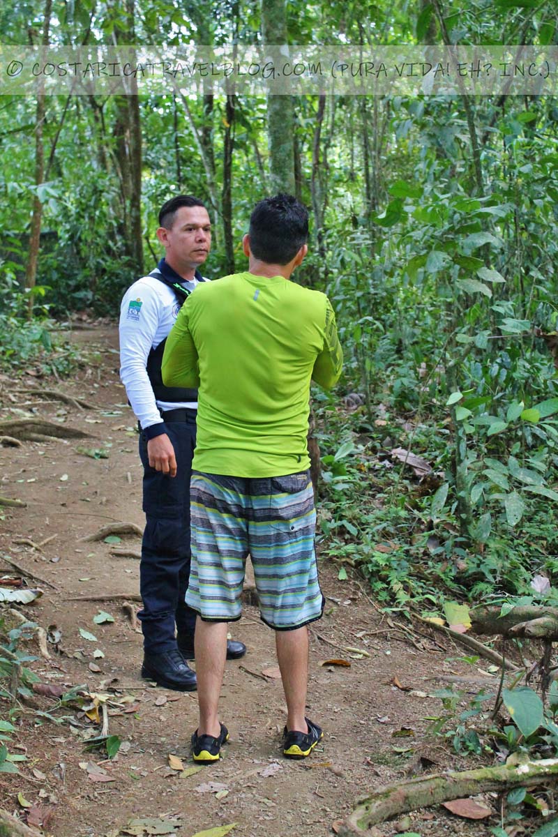 If you’re feeling risky, you can park along the side of the road either before or after the bridge. This is the only parking nearby, however, spots are neither marked, official, or secure. Theft from vehicles has occurred in the area. A local police officer makes occasional rounds at El Salto Costa Rica to warn visitors of the dangers of leaving cars unattended in the area (Ricky is pictured above speaking to one). If you’re worried about parking your car at El Salto Costa Rica, take a taxi to and from the site instead. This will avoid the problem of theft and will also limit opportunities for vehicle vandalism, getting a parking ticket, or being stuck without a place to park if all spots are taken when you arrive.