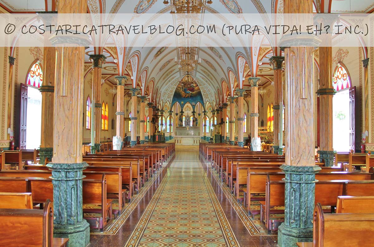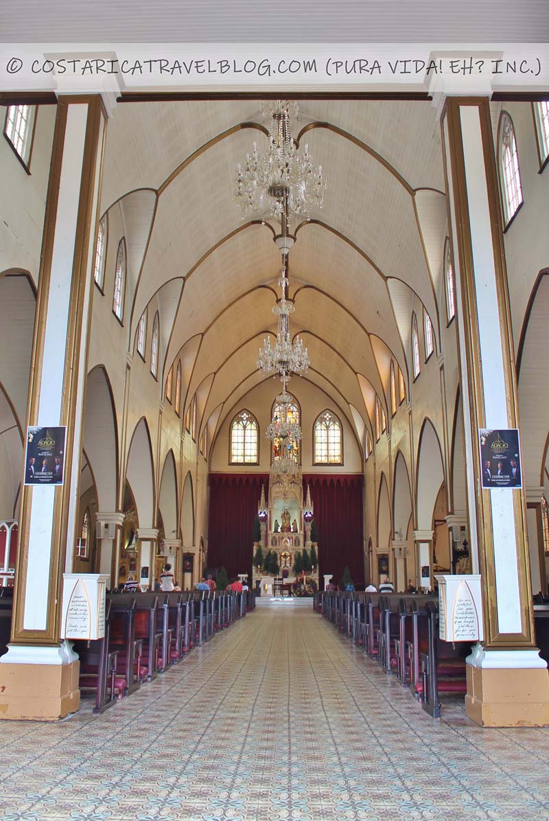 A pretty, public park marks the heart of the pleasant town of Grecia, or, as we know it, the best place to buy a car in Costa Rica (most locals agree). Unmissable on the east side of the park is the long, red Iglesia de Nuestra Señora de Las Mercedes (Our Lady of Mercedes Church) which makes a stunning photo subject. This church is unique in that it was built from metal sheets. Don’t believe us? Give the wall a gentle knock and listen for its tinny clank. Inside, cream walls with gold trim; stained-glass windows that let in beams of light; opulent and translucent chandeliers; and pastel-colored tile floors warm the place of worship and soften the church’s stiff exterior.