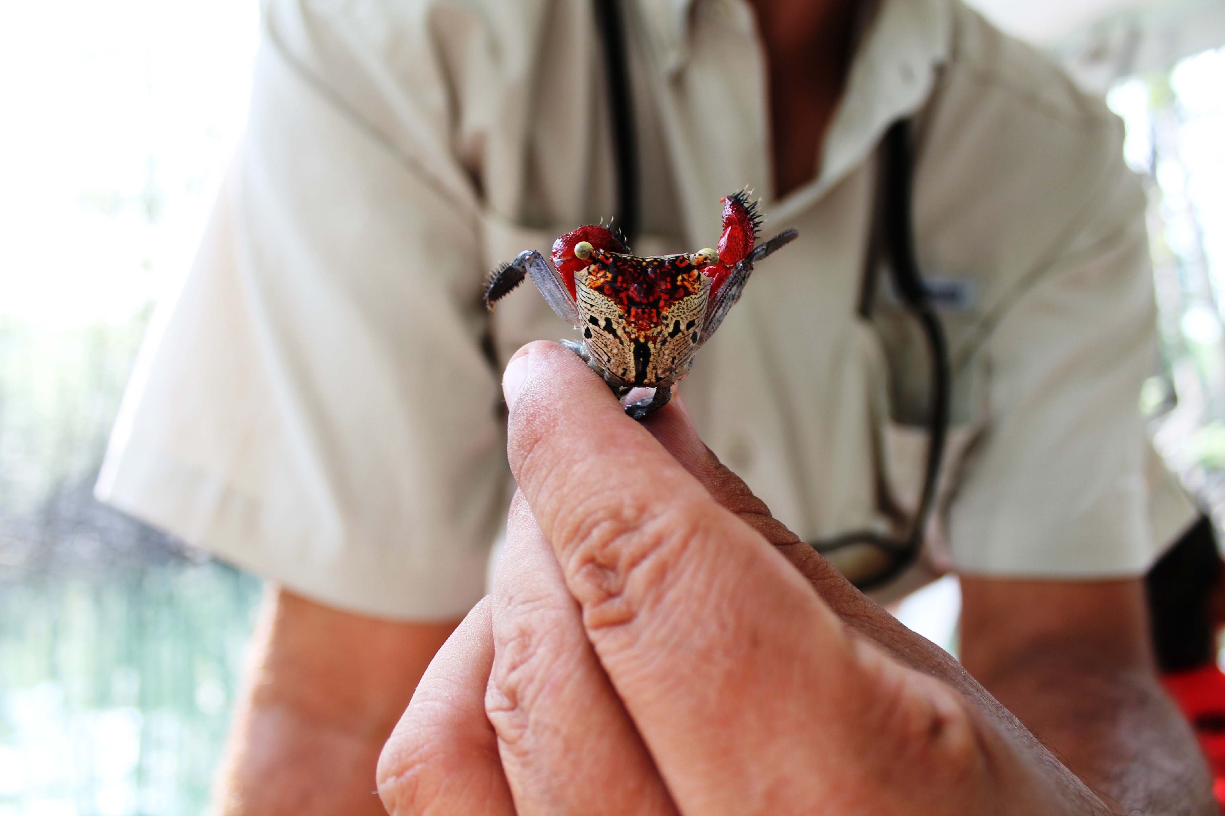 This is a tiger crab. Thanks to him, Ricky and I (along with thousands of other travellers each year) are able to participate in the mangrove tour Costa Rica–a fun and informative boat tour (or kayak tour) experience run just north of the town of Quepos (Manuel Antonio) on the country’s Central Pacific coast. The creature may be tiny, but its importance is great given that a large percentage of the mangroves’ rate of survival is dependent on the quality of the crab’s work.