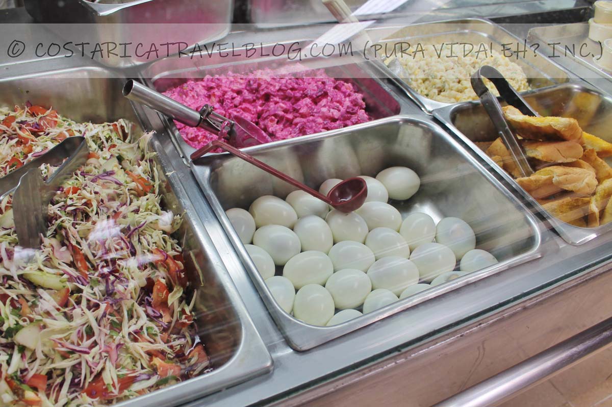 Casados are always accompanied by two, three, or four side dishes, which vary from day to day and across establishments. Popular casado side dish options include ensaladas (salads, such as green salad, pasta salad, and Russian salad—more on these below), vegetales mixtas (mixed vegetables), aguacate (avocado), pure de papas (mashed potatoes), platanos fritos (fried plantains), nacho chips, French fries, hard-boiled eggs, and tortillas.