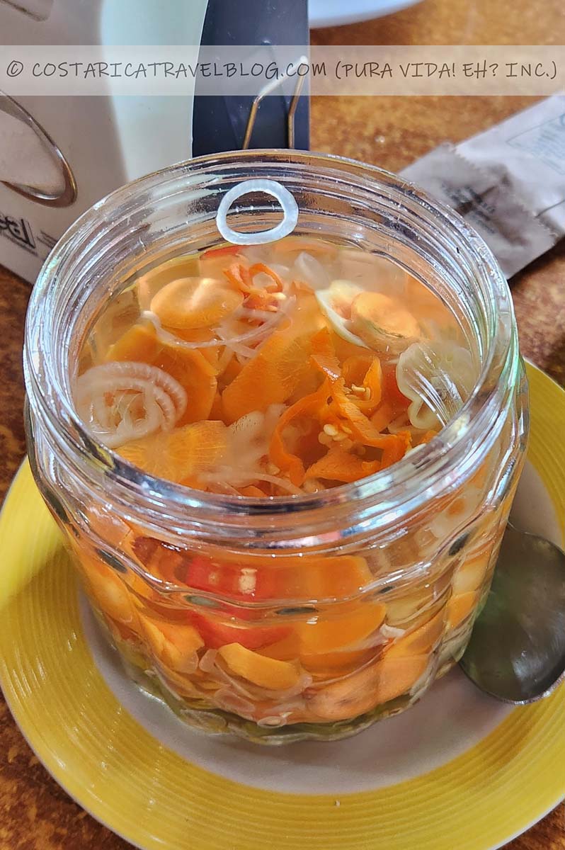 Visit one of Costa Rica’s many sodas (traditional Costa Rican restaurants) and you’ll likely see jars, resembling those in the photos above, atop the tables. The jars contain chilera (sometimes called chilero), a much-loved condiment featuring fermented vegetables (typically onions and carrots but sometimes cauliflower and cucumbers) that locals use to add flavor to their food. Chilera/chilero has a vinegar base, so expect a tangy taste, and it often features peppers and/or spice, which give the mix a spicy kick. Some people scoop helpings of vegetables out of the jar and others collect merely a spoonful of the liquid to pour over the top of their food. You can add chilera/chilero to any kind of food that you’d like to add flavor to, but it most commonly tops rice dishes and meats.